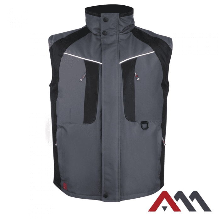 Ocieplany bezrękawnik, wykonany z wodoodpornego materiału Oxford 450D poliester impregnowany PU. W kolorze szaro-czarnym z odblaskowymi elementami. Poliestrowa ocieplina 180g/m2, od wewnątrz pikowana podeszwka.