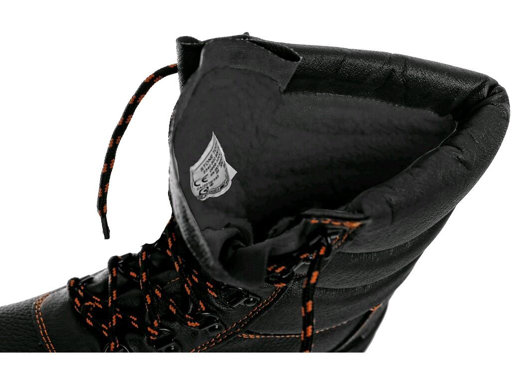 Buty do pół łydki zimowe STONE TOPAZ S3 SRC/ CXS spełniają normy EN 20345 (środki ochrony indywidualnej - obuwie bezpieczne), S3 (obuwie ochronne, odporność podeszwy na przebicie z silą 1100N, urzeźbiona podeszwa, podnosek, nieprzepuszczalność wody), SRC (odporność na poślizg na podłożu ceramicznym pokrytym roztworem laurylosiarczanu sodu (SLS) i na podłożu ze stali pokrytym glicerolem). Wysokie, ocieplane buty robocze rewelacyjne na chłodniejsze dni. Wykonane z wodoodpornej skóry bydlęcej o grubości 1,6 - 1,8 mm. Występuje w rozmiarach od 37 do 50 w kolorze czarnym z kontrastującymi pomarańczowymi szwami. Doskonałą ochronę przed zimnem zapewnia podszewka Cambrelle, wyłożona sztucznym ciepłym futerkiem. Obuwie posiada stalowy podnosek, który skutecznie chroni palce przed uderzaniem z siłą 200J. Odpowiednio zaprojektowana podeszwa z PU/PU gwarantuje bardzo dobrą amortyzację stopy. Antypoślizgowa i olejoodporna podeszwa zapewnia dobrą przyczepność nawet na ceramicznym i stalowym podłożu. Buty wyposażono w stalową wkładkę antyprzebiciową, która chroni stopę przed uszkodzeniem o wystające ostre elementy. Buty wysoko wiązane sznurówką, pozwolą na indywidualne dopasowanie do łydki. Obuwie wyróżnia się stabilną konstrukcją, co przekłada się na wygodę, bezpieczeństwo i wydajność w pracy. Zalecane do stosowania przy pracach prowadzonych na powietrzu w czasie zimnych, mroźnych dni, na nieregularnym i śliskim podłożu, placach budowy itp.