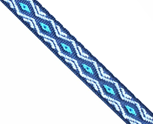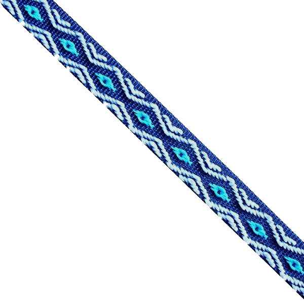Tkany pasek do ukulele, niebieski z etnicznym kolorowym wzorem. Regulowana długość, haczyk do zaczepienia do instrumentu.