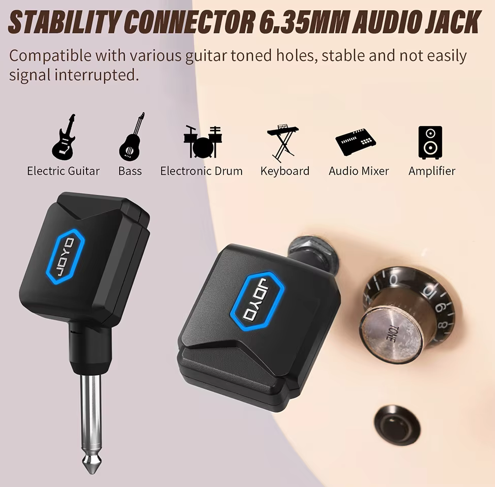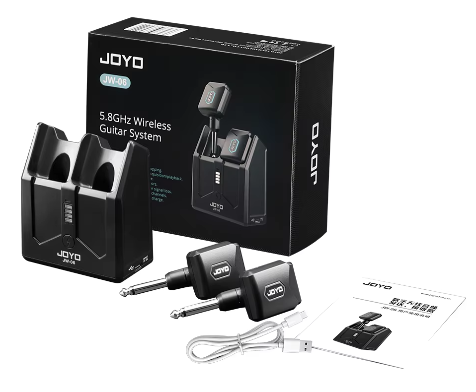 JOYO JW-06 to bezprzewodowy system dla gitar i basów, umożliwiający podłączenie instrumentu do wzmacniacza bez użycia kabli. Działa w paśmie 5,8 GHz, co zapewnia stabilną transmisję sygnału i minimalizuje zakłócenia. Urządzenie jest proste w obsłudze i oferuje wysoką jakość dźwięku, sprawdzając się zarówno podczas występów na żywo, jak i w studiu. Zestaw składa się z nadajnika podłączanego do gitary oraz odbiornika łączonego ze wzmacniaczem. Wbudowany akumulator umożliwia 6-8 godzin ciągłej gry.