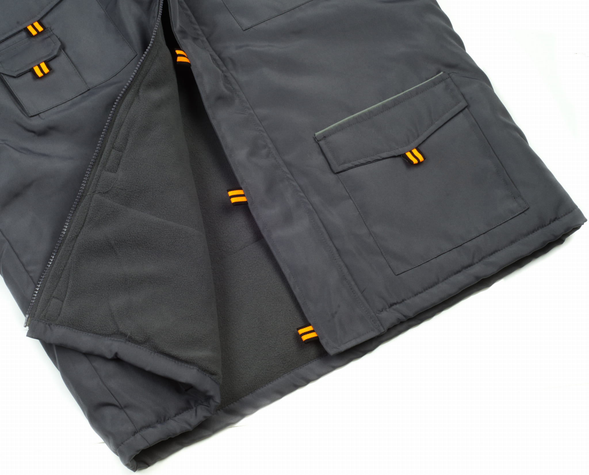 Bezrękawnik w kolorze szarym, ocieplany polarem z dużą ilością kieszeni.