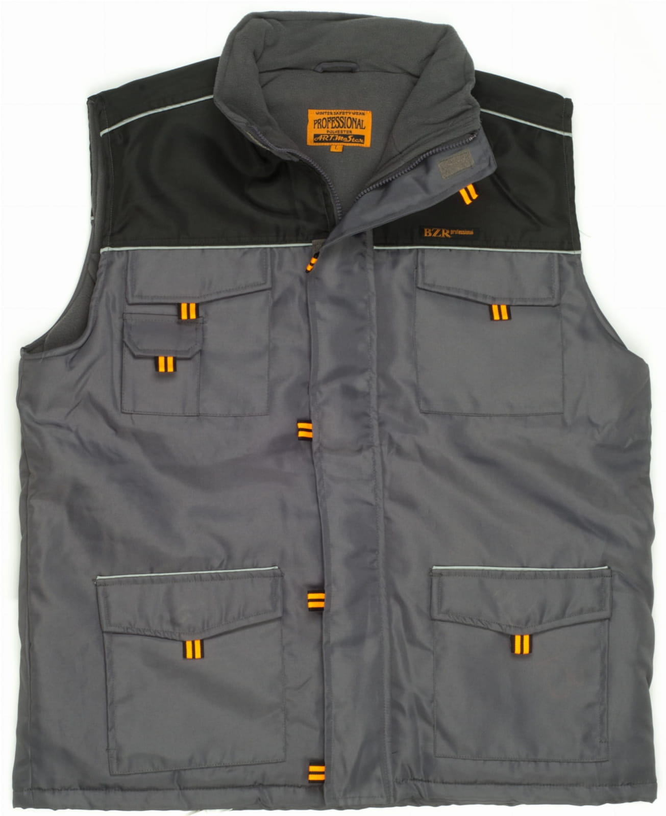 Bezrękawnik w kolorze szarym, ocieplany polarem z dużą ilością kieszeni.