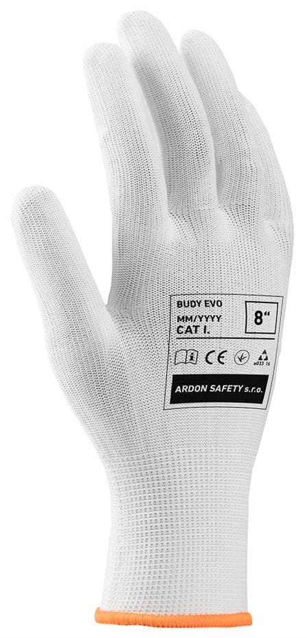 Rękawice robocze BUDDY EVO, spełniają normy EN 420/ EN 388. CAT.I. Rękawice wykonane z wysokiej jakości bawełny i nylonu, wewnętrzna część dłoni pokryta mikro nakropieniem PVC. Bezszwowy krój zapobiega podrażnieniom skóry. Elastyczny ściągacz pozycjonuje rękawicę i zapobiega jej zsuwaniu. Anatomiczny kształt rękawic zapewnia dobre dopasowanie. Bardzo przyjemne i komfortowe w noszeniu a nakrapiana powierzchnia sprzyja dobremu chwytowi. Stosowane w pracach lekkich, transportowych, magazynowych i porządkowych.