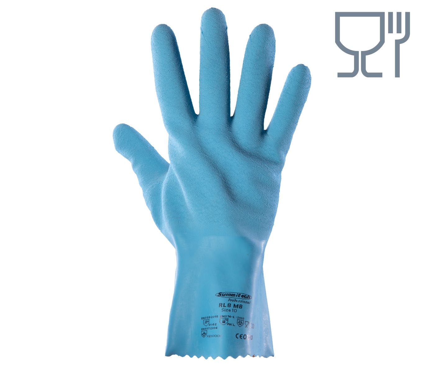 Rodzaj rękawicy: rękawica chemiczna, Długość rękawicy: 300 mm, Materiał/Dzianina: w kolorze niebieskim, rękawice wykonane z wodoodpornego naturalnego kauczuku na kanwie syntetycznej dzianiny nylonowej, EN 388 - Odporność na uszkodzenia mechaniczne: 3: odporność na ścieranie, 1: odporność na przecięcie, 4: odporność na przedarcie, 2: odporność na przebicie, X - odporność na przecięcie wg ISO 13997; EN 374-1 - Odporność na przenikanie substancji chemicznych: A : Metanol, K : Wodorotlenek sodu 40%, L : Kwas siarkowy 96%, EN ISO 374-5 : 2016 - Rękawice chroniące przed mikroorganizmami: TAK; Rękawice dopuszczone do kontaktu z żywnością: tak,