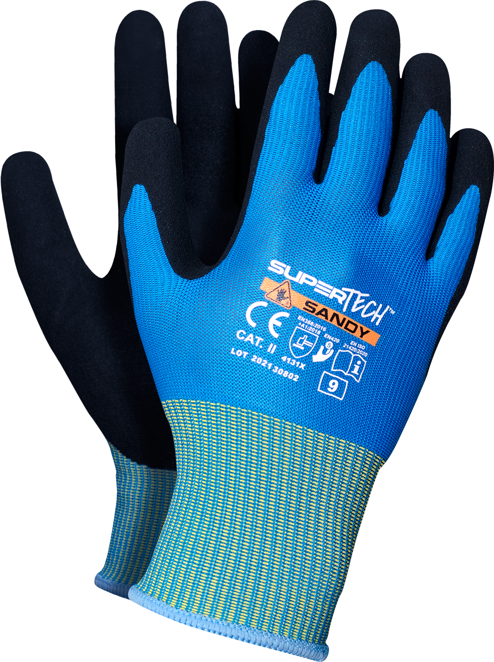 Rękawice ochronne wykonane z dzianiny nylonowej (splot 13G), w kolorze niebieskim, w części dłoniowej pokryte nitrylem typu sandy finish. Nitryl zwiększa odporność na tłuszcze i oleje, a technologia piaskowa zwiększa elastyczność i zręczność rękawicy.
