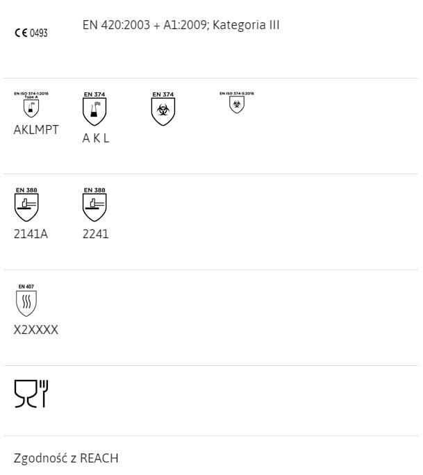 - EN 374-1:2016 Type A (rękawice chroniące przed niewielkimi zagrożeniami chemicznymi i mikroorganizmami)