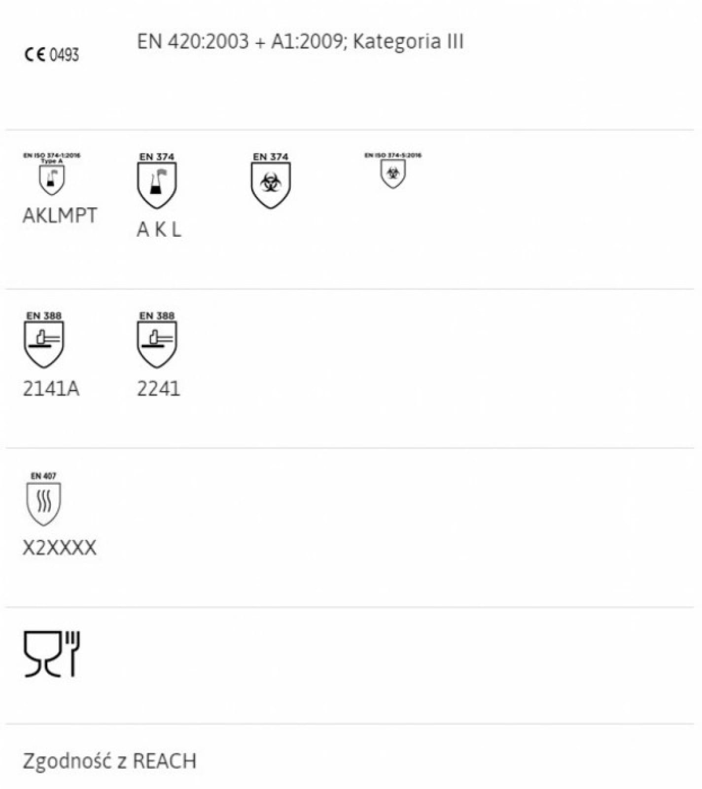 - EN 374-1:2016 Type A (rękawice chroniące przed niewielkimi zagrożeniami chemicznymi i mikroorganizmami)