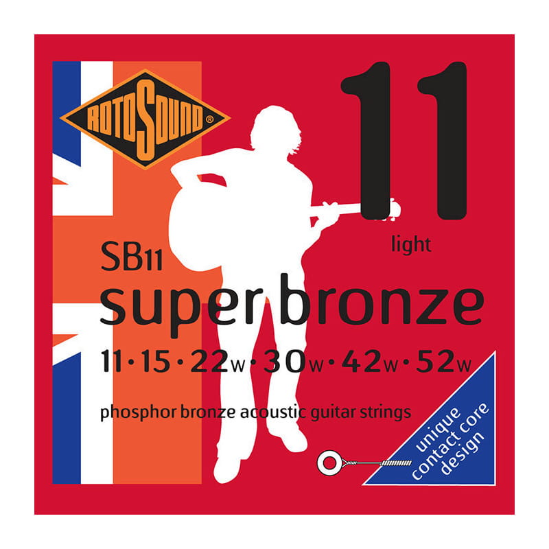 Seria Rotosound Super Bronze to struny do gitary akustycznej w fosforowobrązowej owijce zapewniającej ciepłe i w pełni zbalansowane brzmienie. Struny w owijce opierają się na mostku bezpośrednio o ich stalowy rdzeń, a nie owijkę, jak w przypadku standardowych strun. Dzięki temu wybrzmiewają dłużej, a akcja strun delikatnie obniża się. Komplety są pakowane hermetycznie, co gwarantuje ich świeżość i jakość.