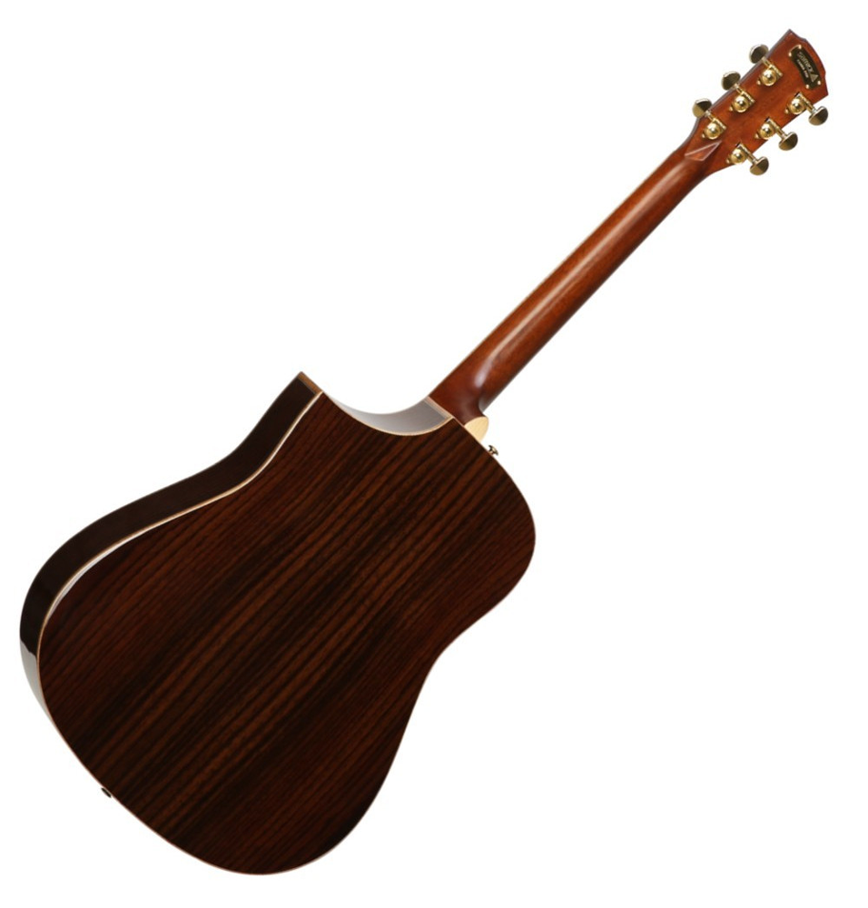 Typ korpusu: Dreadnought z wycięciem (cutaway) – zapewnia mocne brzmienie i łatwy dostęp do wyższych progów.