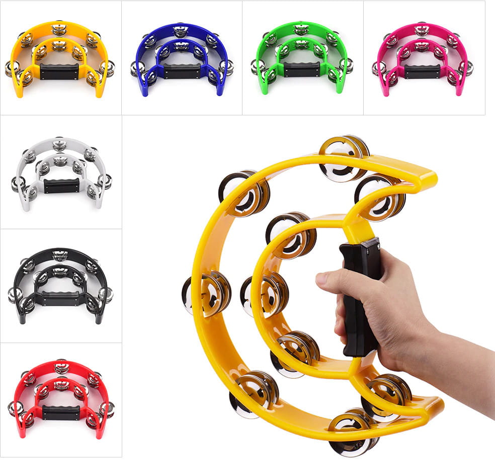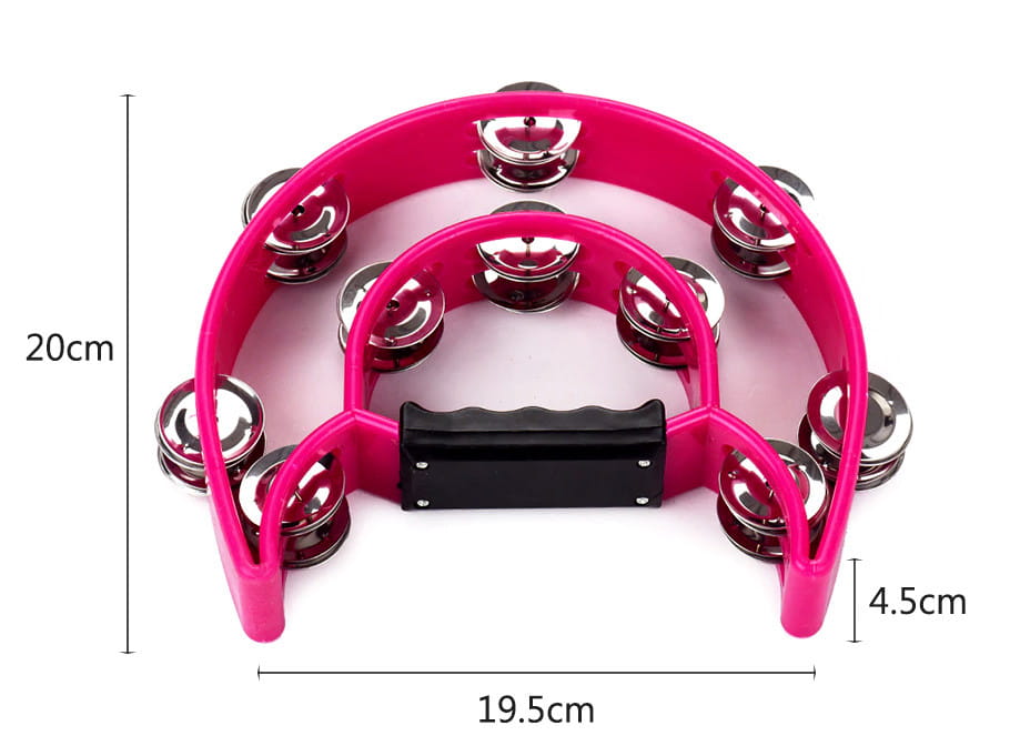 Tamburyno solowe w kształcie podwójnego półksiężyca z wygodnym, profilowanym uchwytem. Wykonane z trwałego, odpornego na uszkodzenia plastiku. Ma po dwa rzędy dzwonków ułożonych w parach, w sumie 20 par.