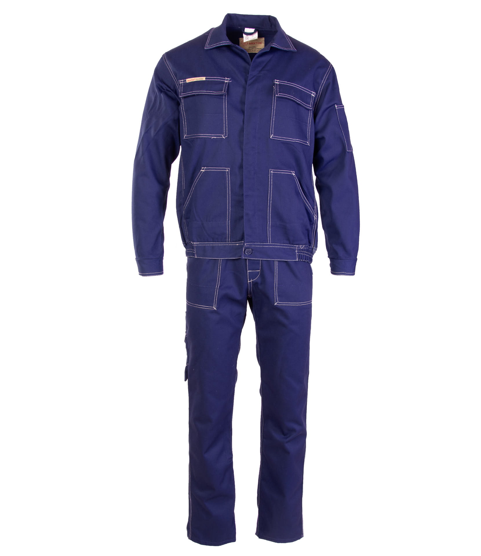 Bluza: zapinana na guziki, kryte listwą, posiada zaszewki na plecach zwiększające swobodę ruchów, duża ilość ryglówek w miejscach szczególnie narażonych na rozprucie, transpiratory powietrza, dwie górne kieszenie w tym jedna kryta listwą, zapinana na rzep, brak kieszeni bocznych, kieszeń na komórkę, mankiety przy rękawach zapinane na guzik, podwójne szwy, szyte widoczną, mocną nicią, na dole bluzy gumka ściągająca, dzięki czemu bluza nie odstaje i zabezpiecza przed wiatrem, wykonana z wysokiej jakości materiału, który zapewnia po wielokrotnym praniu stabilność kolorów i rozmiarów, kieszonka na długopis. Spodnie ogrodniczki: duża ilość ryglówek w miejscach szczególnie narażonych na rozprucie, możliwość regulacji w pasie za pomocą guzików oraz gumki wszytej w tylnej części spodni, długie, szerokie, regulowane szelki, dwie kieszenie boczne, wzmocnione kieszenie boczne, wzmocniona kieszeń zapinana na rzepy, kieszeń na komórkę, kieszeń na długopisy, kieszeń na miarkę „metrówkę”, szlufka na młotek, podwójne szwy, szyte widoczną, mocną nicią, wykonane z wysokiej jakości materiału, który zapewnia po wielokrotnym praniu stabilność kolorów i rozmiarów, wewnętrza kieszeń na dokumenty zapinana na zamek, Gramatura: 290g/m2; Materiał: Poliester/Bawełna (65% /35%);