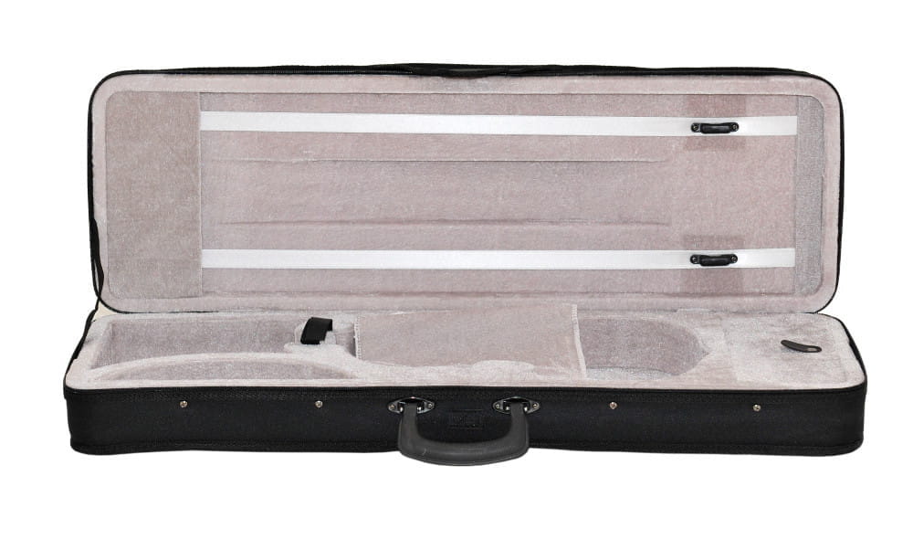 - Wewnątrz pokrycie miękkim welurem w kolorze szarym, doskonale chroniącym skrzypce przed uszkodzeniami mechanicznymi.